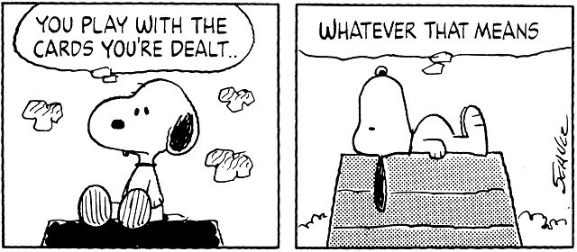 ÇÛ¤é¤ì¤¿¥«¡¼¥É¤Ç¾¡É餹¤ë¤·¤«¤Ê¤¤¤Î¤µ¡ØÇÛ¤é¤ì¤¿¥«¡¼¥É¤Ç¾¡É餹¤ë¤·¤«¤Ê¤¤¤Î¤µ¡Ù¡Ê¸¶¸ì¡§You play with the cards you're dealt... whatever that means.¡Ë¤Ï¡¢¥¢¥á¥ê¥«¤ÎÌ¡²è¡Ø¥Ô¡¼¥Ê¥Ã¥Ä¡Ù¡ÊPEANUTS¡Ë¤ËÅо줹¤ëÍ̾¤ÊÂæ»ì¤Ç¤¹¡£¥Ó¡¼¥°¥ë¸¤¤Î¥¥ã¥é¥¯¥¿¡¼¥¹¥Ì¡¼¥Ô¡¼¤¬È¯¤·¤¿¸ÀÍդȤ·¤Æ¡¢À¤³¦Ãæ¤Ç¹¤¯ÃΤé¤ì¤Æ¤¤¤Þ¤¹¡£