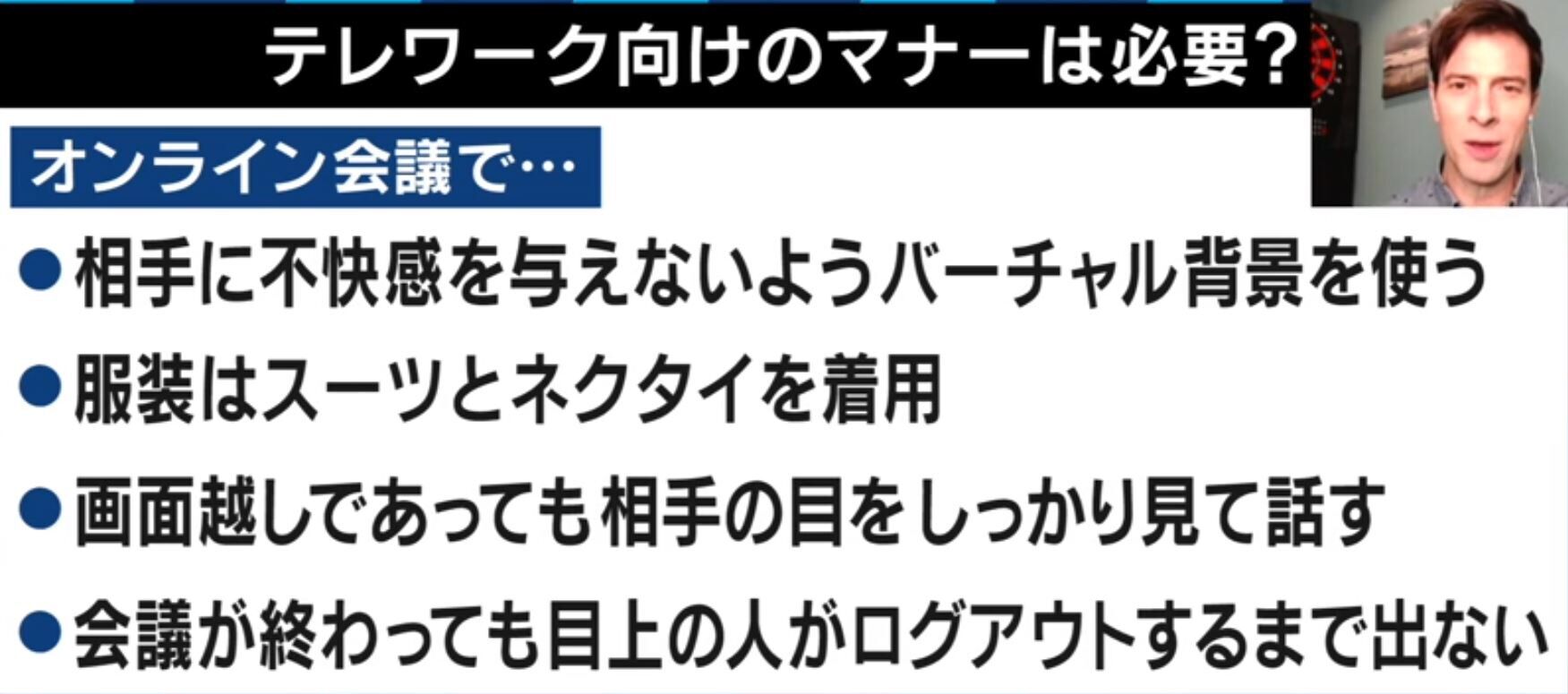 【画像】テレワーク勤務のマナーがひと通り出揃ってしまう・・・やっぱりスーツはマストなんだね